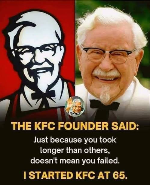 → 65 साल के कर्नल सैंडर्स ने KFC शुरू किया था! उम्र सिर्फ़ एक नंबर है, जुनून ही उम्र को हराता है! 🎯